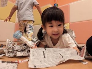 そしてお部屋の中では、新聞をビリビリとみんなで破き、