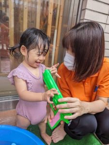 保育士と一緒にお水のかけ合いっこ楽しいね(^^)