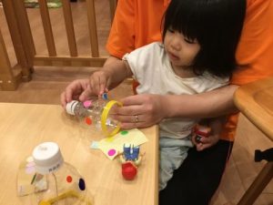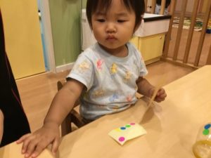 もも組さんは一人で貼るのが難しいので保育者と一緒にペタペタしました。