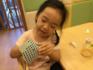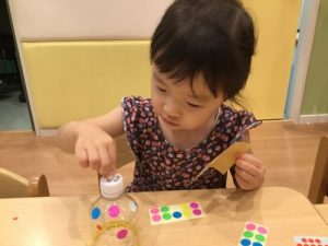 お手本を見せると一斉にシールをペタペタペタペタ…
