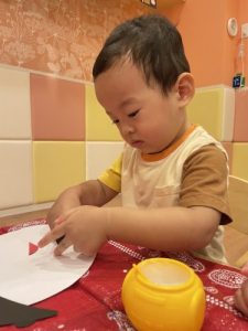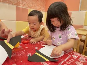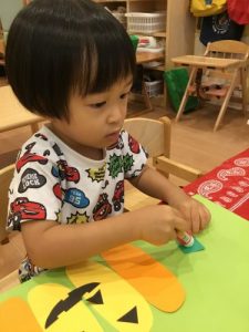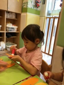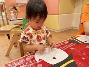 最初にお手本でおばけの身体に目と口を貼り見せると「〇〇ちゃんも!やる!」と興味津々のお子さまたち。初めてノリを使い「どうやってやるの?」と聞き、保育士に見守られながら自分たちで塗ってペタペタ貼るのを楽しむ姿がありました!