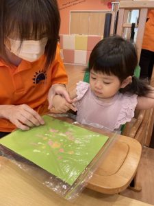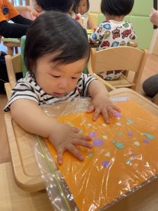 もも組さんは画用紙に色々な色の絵の具を点々と出し、その画用紙をそーっとジップロックに入れて上からペタペタのびのびと指でのばす、フィンガーペイントを楽しみました。最初は何、コレ?って感じでジップロックを見つめていましたが、保育者がピカピカブーのペッタンペッタンペタ🎵を歌いながらお手本を見せてあげると、まねっこをしてペタペタ!ニッコリ♡これだと直接絵の具に触れることがないので、手を口に入れるもも組さんでも取り組みやすくて、たくさん楽しむことが出来ました🎃