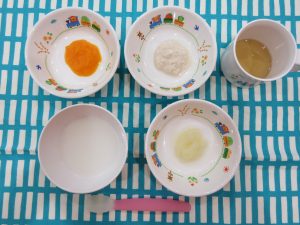 【離乳食(初期)】エネルギー50kcal たんぱく質1.3g 脂質0.5g 粥 野菜スープ にんじん...