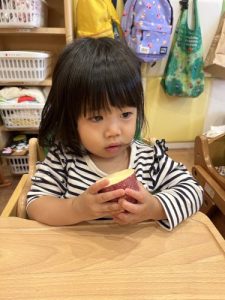 実際に切ると「やった〜黄色だ!!」「まんまるお月様🌕だ!」と大盛り上がりの様子のりんご組さん🍎です✨