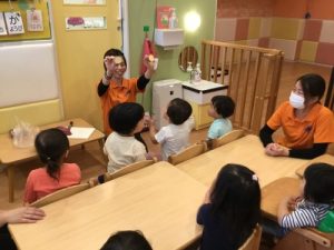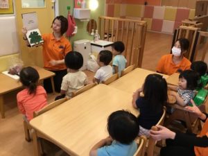最初に『どんどこどん』という絵本を見て、お野菜が土の中でどのように育っているのかを学びました。お子さまたちは「にんじん🥕!」「ジャガイモ🥔!」「だいこん!」などと、夢中になって最後まで聞いてくれていました^^