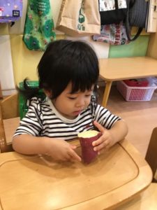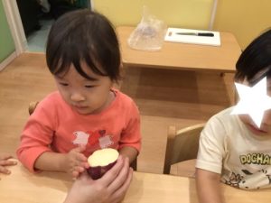 さつまいも🍠を切ると、「どんな形になるかな?」「色はどんな色?」と質問すると、