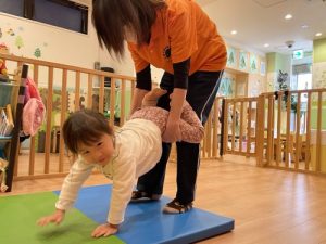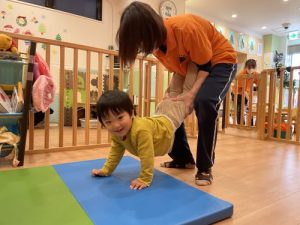保育士にお手本の真似をしながら、挑戦します