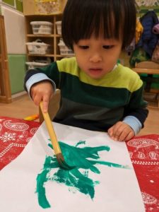 りんご組さんは初めて書道の筆を持ち緑の絵の具で墨絵のように、来年の干支の辰の体をダイナミックに描きました🐲