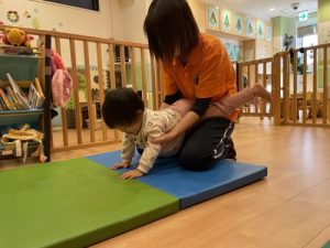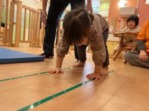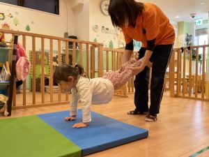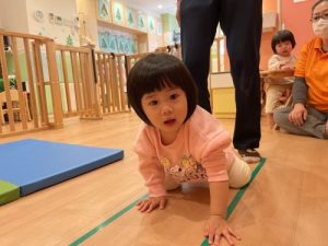 最近ではちょっと難しい前転にも挑戦しています。保育士がお手本を見せた後、色々と注意ごとを話し、いざ挑戦!難しいかな?っと思っていましたが、みんなとっても上手に回る事が出来ていました。クマ歩きもとっても上手ですよ!