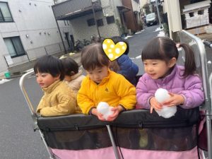 「わー!雪だ」と嬉しそうな声が聞かれたり、「ゆーきやこんこ、あられやこんこ♪」と歌ったりし、保育士が雪だるまを作って渡すと「雪だるま!〇〇ちゃんにもちょうだーい!!」とワクワクしている様子が見られました。