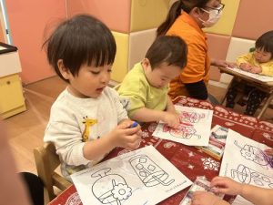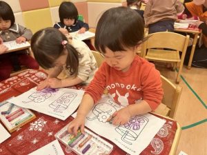 気温も一気に低くなり、肌を刺すような冷たい風に頬や鼻を赤らめながらも、散歩先でお店屋さんごっこやかくれんぼをして「いらっしゃいませー!何にしますか?」と言葉のやり取りを楽しんだり、「もーいーかーい!」「もーいーよー!」と身体をたくさん動かしたりして、元気いっぱいに遊んでいるお子さまたちです。