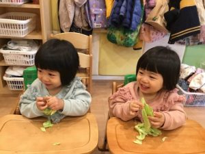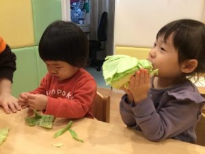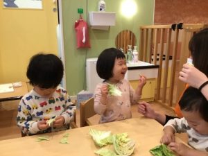 食育では、「キャベツ」を切ったり、匂いを嗅いだり、触ってみたりしました!