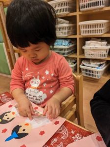 いちご組さんやもも組さんは、好きな和柄折り紙を「これにする!」と自分で選び