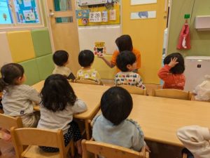 最近、ひらがなが読めるようになっているりんご組さんは、絵本のタイトルを読んでくれています📚