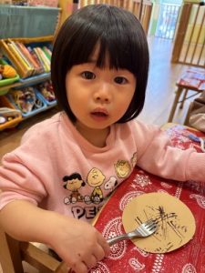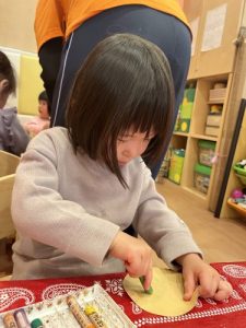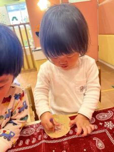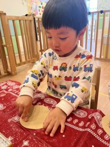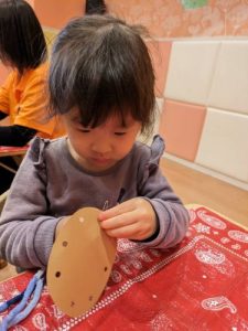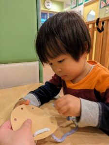 まずは🍎りんご組さんの様子を紹介します。りんご組さんは、つくしに毛糸で紐通しをしました。みんな真剣な表情で、手先を器用に使い、上手に紐通しをしていました。真剣で一生懸命取り組む姿が、とってもかっこよく、頼もしかったです✨