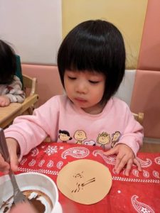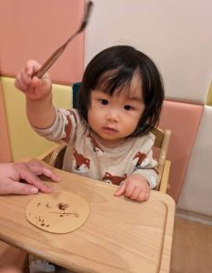 最後に🍑もも組さんの様子を紹介したいと思います。もも組さんは、フォークに茶色の絵の具をつけて、つくしを描きました。とても楽しんで、一生懸命フォークをもち描いて素敵な作品が出来ましたよ^^