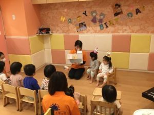 先生からのプレゼントはバースデーケーキの手作り絵本シアターでした。材料を混ぜ混ぜして、スポンジケーキを焼いたら、クリームといちご🍓をトッピングして、ほら素敵なお誕生日ケーキの出来上がり✨✨みんな集中して聞いてくれていましたよ☺️最後は、みんなでろうそく🕯️をふーっと消して、お祝いのケーキ🧁を食べましょう!!というお話で、みんな素敵な笑顔を見せてくれていました♡