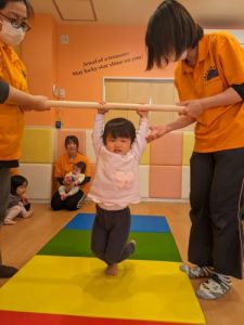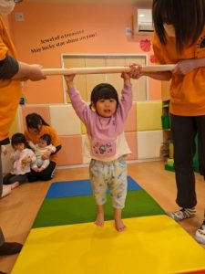 さて、今年度最初の体操はマットを使用してジャンプ、クマ歩き、鉄棒のようなぶら下がり運動、よーいドンのかけっこをしました。保育士がマットの上でカエルさんやウサギさんになってジャンプジャンプ♬するよ~っとお話しすると、「やる~やりた~い!」っと声が上がります。ちゃんと座って待っていたお子さまから名前を呼んで、ハイ!スタートです!