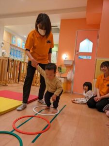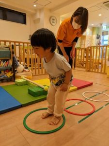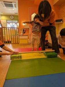 朝の会が終わった後にカリキュラムを始めるのですが、マットや輪っか、棒を用意していると、今日は何するんだろ~っと興味津々で見つめてきます。今日は~何々するよ~っと話をすると、よりいっそうソワソワが始まります。