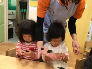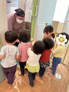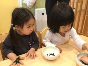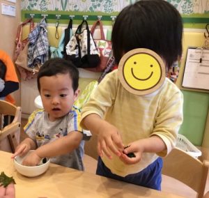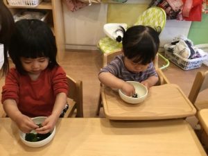食育では、わかめに触れました。乾燥したわかめと水にふやけたわかめを触り比べ興味津々のお子様たち!!「硬い」「ふにゃふにゃ」と可愛らしい表現で教えてくれました♡触りながらお腹がすいてしまったのか思わず食べてしまいそうになるお子様も🤤