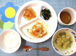 (写真は離乳食後期です。年齢によって形、固さ、盛り付け量を変えて、提供しています。)