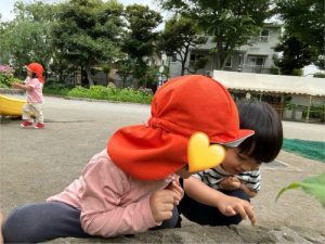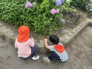 花壇の側では、お子さまたちがしゃがみ込んで何やら井戸端会議をしています⭐︎☺︎