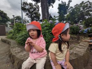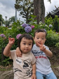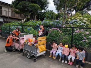 お子さまたちも白山神社に着いた途端現れる紫陽花を目の前にして、目をキラキラ✨させていましたよ。これは青だね〜や、赤〜、白〜っと色とりどりの紫陽花をたくさんたくさん見て、皆んなで記念撮影をしました。紫陽花に負けないぐらい、キラキラ笑顔で撮れましたよ📷🥰