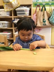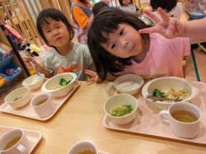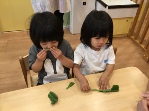 食育活動では、小松菜をお子さまたちにちぎってもらいました。クンクンと香りを楽しんだり「どんな音がする?」と音を楽しんだり、興味津々にお野菜に触れる姿が見られました🥬✨