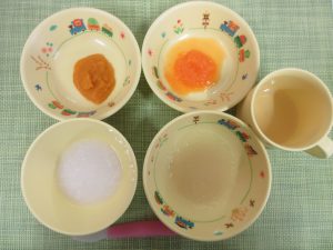 (写真は離乳食後期です。年齢によって形、固さ、盛り付け量を変えて、提供しています。)