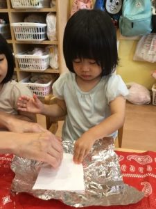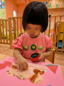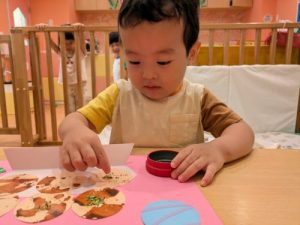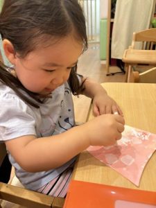 「せんせー見てみて」「できた!」「キャハハ」と話し声、笑い声で溢れているいちご組さんの製作です^^