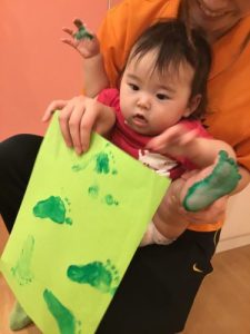 絵の具を足の裏に塗ったのがこそばゆいようで、「えへヘ😖」と笑ってくれましたよ✨