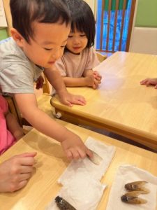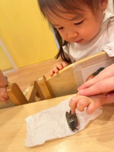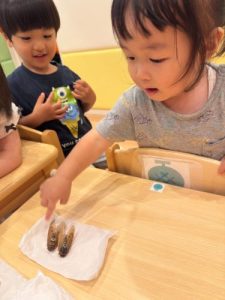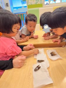 夏の時期にしか見られないセミをみんなで見たり触ったり″𓆦″みんなでチョン。触るのが初めてでドッキドキだったお子様たち🤭💕羽の色の違いや大きさ、形を比べながらとてもいいお勉強ができました🧚✨