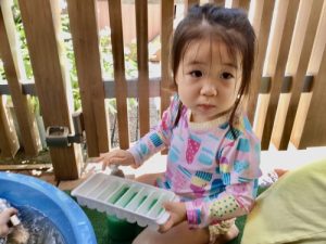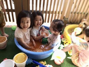 いちご組さんとりんご組さんは色水を作ったりプールに寝そべったり( ¨̮ )♡