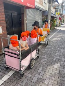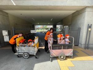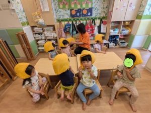 9月2日月曜日に避難訓練を行いました。防災頭巾を被りなんだか楽しそう☺️お互いを見つめ合いながら「頭おっきいね〜!」「かわいいよね!」と嬉しそうにおしゃべりする姿も見られました♡その後は、避難場所まで移動し保育園に帰宅しました。暑い中バギーを押す保育士に「先生がんばれ〜🎌」と応援してくれた優しいお子さまたちです☺︎