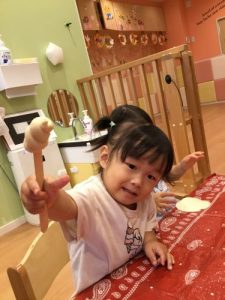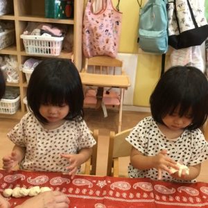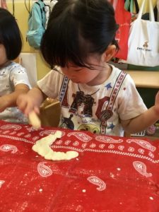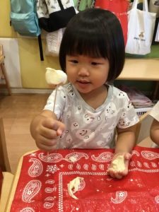 最初は小麦粉粘土感触が苦手なお子さまもいましたが、お友達の様子を見ながら、次第にチョンチョン触り、最後には、こねることができていましたよ✨