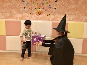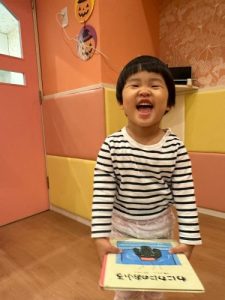 朝登園してから「今日は魔女さん来るんだよ〜!!」と楽しみで胸がいっぱいのお子さまたち。朝の会を済ましおやつを食べさあ!お楽しみのハロウィン会の始まりです🎃✨まず初めは、ハロウィンってどんな日?スケッチブックシアターでみんなで確認し合い、いよいよ今までたくさん練習してきたあの言葉👻「トリックオアトリート‼️」練習通りとっても上手に言うことができていましたよ𖤐 ̖´-