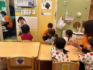 そしていよいよ、りんご組さんのお当番が始まりました🍎今日のお当番は?○○くん(ちゃん)だね!とお当番カードに注目です。朝の会やお帰りの会、お給食の時に前に立って保育者と一緒にお歌を歌い、ご挨拶も一緒にします!とーってもカッコいいんですよ!✨