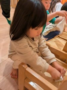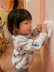 27日は大掃除をしました。りんごぐみさんといちごぐみさんはお椅子とお壁を、ももぐみさんは毎日座っているお椅子を「ありがとう」の気持ちを込めて一生懸命掃除しました‪‪︎✿·͜·