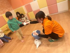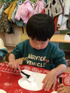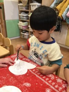 シェービングフォームとボンドを混ぜて鏡餅を作りました。泡とボンドを混ぜる過程から参加( ˊᵕˋ )𖤐 ̖´-わくわくドキドキ!!体を前のめりにし覗き込むお子さまたち。思わず口が開いてしまうほど真剣でキラキラな眼差しがたまらなく愛おしくて…💓出来上がった後は触ってみよう!!「ふわふわ〜」「もちもち〜」嬉しそうに担任の先生と感触を楽しみました🧚✨