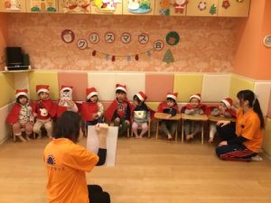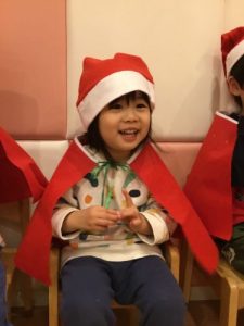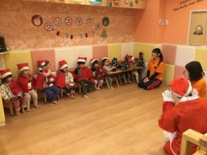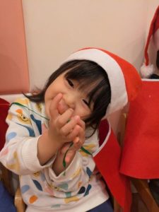 みんなが大好きな「あわてんぼうのサンタクロース」を踊り、「トントントン、どなたです?ガチャッ!!」クリスマスのスケッチブックシアター💛すると、、、「シャンシャンシャン🔔𓈒𓂂𓇬」ついに待ちに待ったサンタさんが🎅🏻‼️ドキドキで固まってしまうお子さま、嬉しくてたまらないお子さま、サンタさんを目の前に驚いて口が開いてしまったりと様々なお子さまの表情が見られました💕サンタさんからプレゼントが🎁「ありがとう。」ときちんとお礼も言えていましたよᕷ*.°