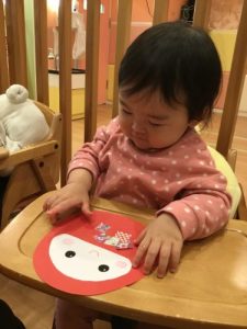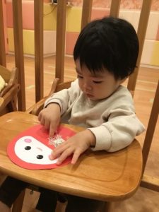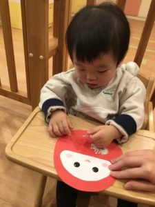 今までは手形や指スタンプの製作が多かったももぐみさんでしたがのり付けに挑戦してみました。保育者がのりを付け、折り紙を置いてあげると、とっても上手に人差し指でポンポンと押しながら貼り付ける姿が見られました!!日に日に大成長のももぐみさんに保育士一同感動でした👏✨