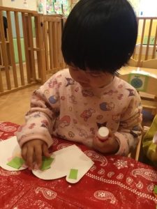 🍎りんご組さんは手袋に切り紙を貼り、泡とボンドを混ぜて手袋の飾りのモフモフを作りました。切り紙は保育者が見守る中で自分たちでハサミを使って切ったんですよ✂️初めて使うハサミで恐る恐るチョキチョキチョキン♬とっても上手に切ることが出来ました✧*。✧*。可愛いらしい手袋の完成です🧤♥︎ ˎˊ˗