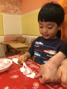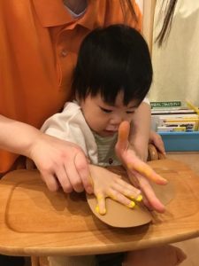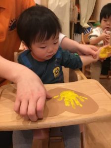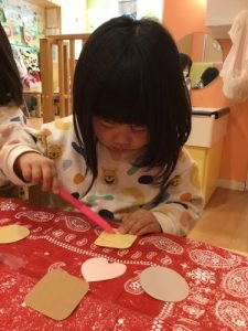 🍑もも組さんは自分たちの手に絵の具を塗り、手形をペタンペタン🖐️その可愛いらしい小さな手形をハートの型にはめ込み、バレンタインのプレゼントの完成です✨