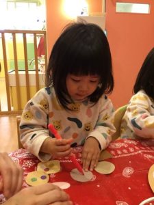 🍓いちご組さんはバレンタインのクッキー缶のクッキーに美味しそうな模様をつけました!シールを器用に剥がして貼り、ノリを上手に使ってカラースプレーに見立てた切り紙をペタペタペタ♬好きな色のペンを持って模様も描きました🌀美味しそうなクッキーが完成しました🍪