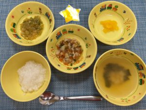 (写真は後期食です。月齢によって形、固さ、盛り付け量を変えて提供しています。)