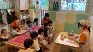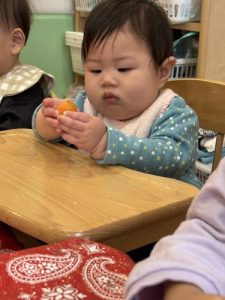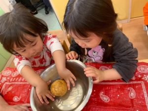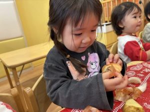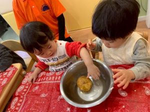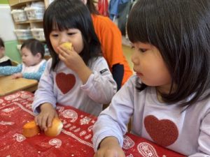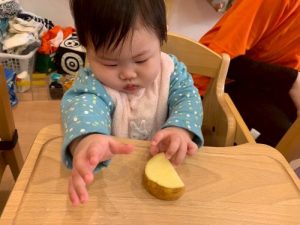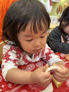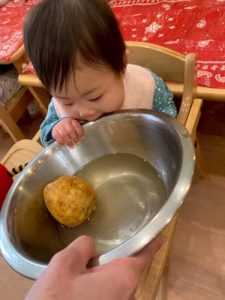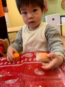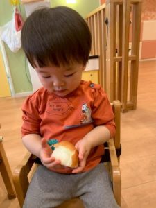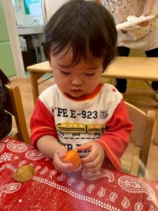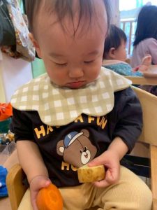 まずは、ジャガイモ!🥔ボールに水を入れ、優しく撫でて土を洗い流しました。中身は何色かな〜で、「しろ〜みどり〜」との声があがります。実際切ると…「しろ〜!」とニッコリ笑顔が見られました😊ニンジン🥕やタマネギ🧅もお子さまたちはワクワク♫ドキドキ♫しながら、”切ったら〜”を楽しんでいましたよ❤︎︎⠜