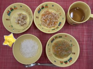 (写真は離乳食後期です。年齢によって形、固さ、盛り付け量を変えて、提供しています。)