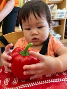 「ピーマン大好き💕」と思わず丸かじりしそうな大きなお口を開けて観察していましたよ✨