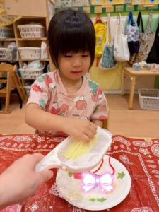 お給食の中で小さく切られたピーマンを一生懸命探していました♪