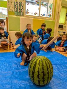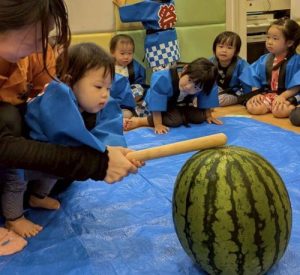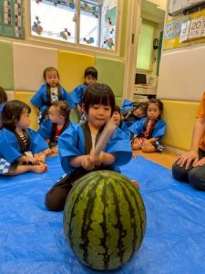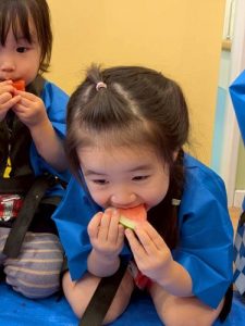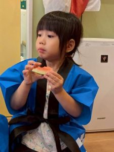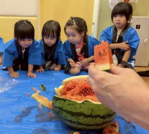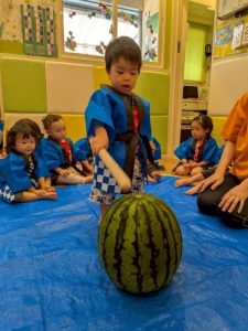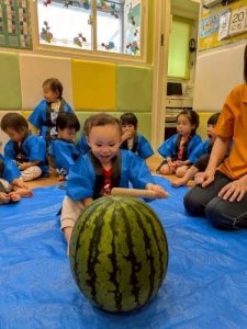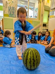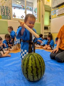 みんな大好きスイカ割り🍉大きなスイカを前に緊張しながらも挑戦する姿や、友だちを「がんばれー!」と応援する姿が見られました。割れた瞬間にはみんなで大喜び🎶みんなで味わったスイカの甘さは、夏の特別な思い出になったことと思います🌟